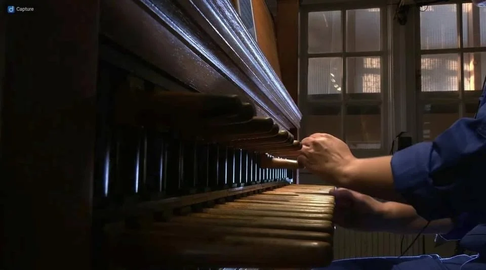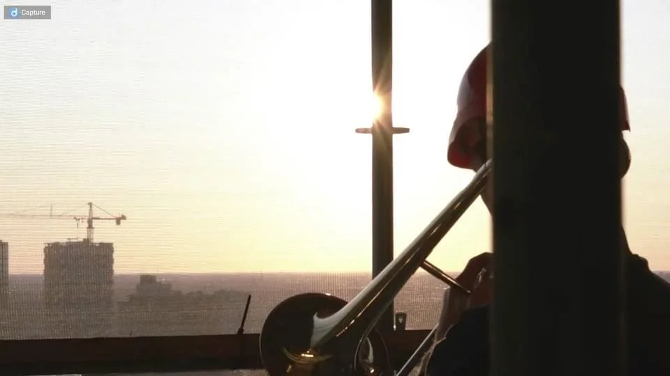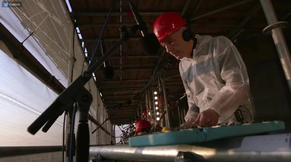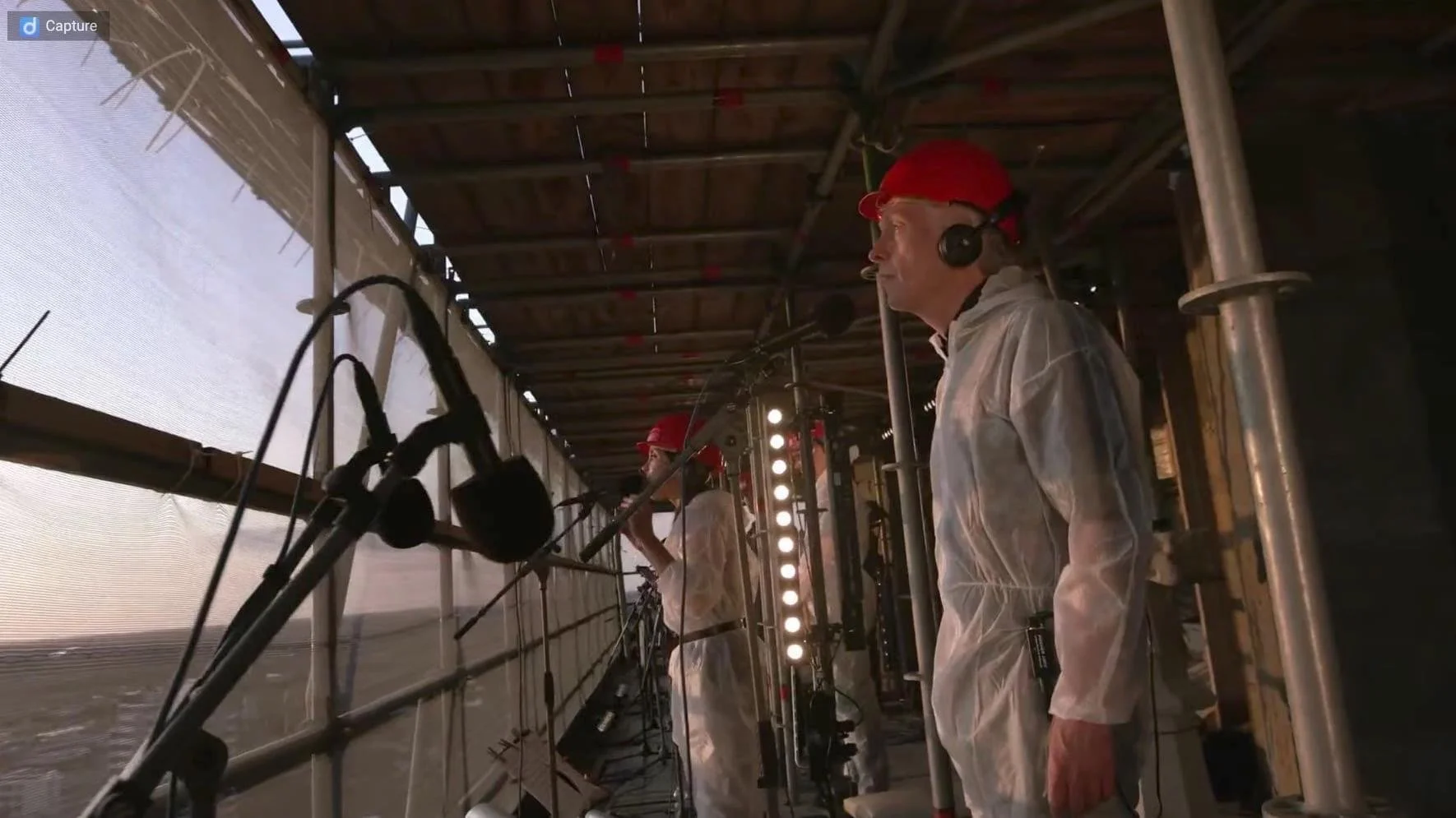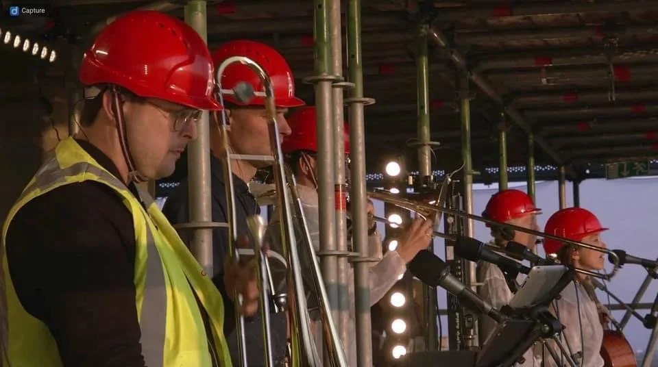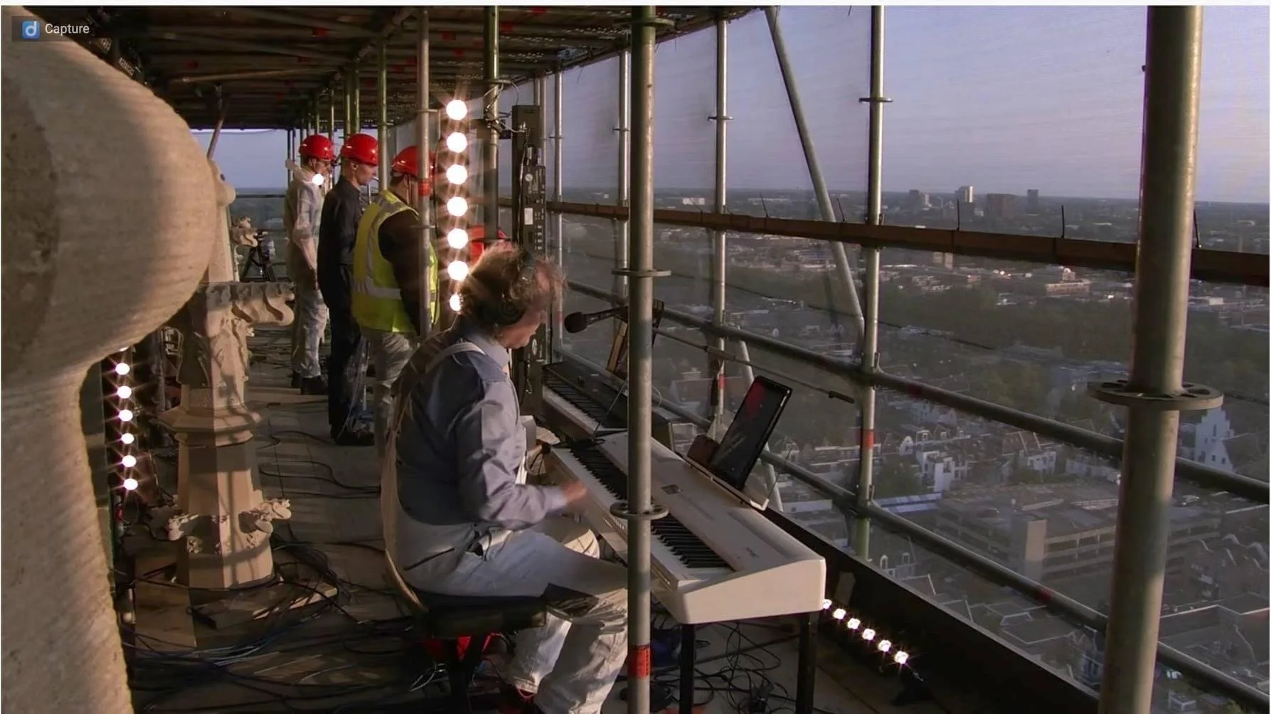 De domtoren staat al een tijdje in de steigers en is dus de perfecte plek voor een concert. Hoog bovenin de toren staat de band van Spinvis met rode helmen op hun hoofd te spelen.